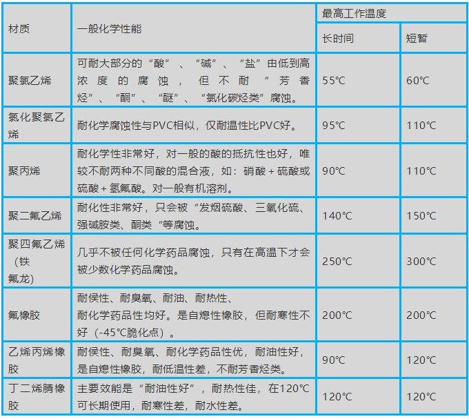 常用非金屬材料適用工況: